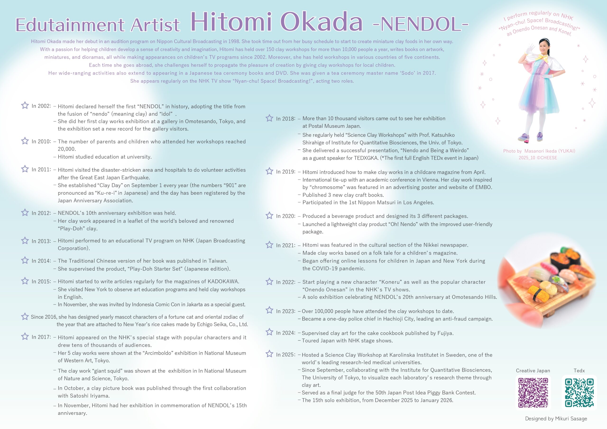 郵政博物館で開催した個展に10,000人以上が来場。NHKハート展に参加、作品が全国で展示される。東京大学の白髭克彦教授(定量生命科学研究所所長)とのコラボレーション、サイエンスねんど教室を開催。ねんど作品が15種類のイオンの写真年賀状に。群馬県で開催された英語イベントTEDxGKAでゲストスピーカーとしてスピーチをする。